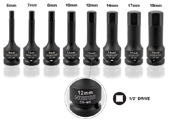 HomeCatalogueAssortment Kits and SetsHex, Star, Tamper Proof, Spline KitsNEIKO 8pc 1/2″ Drive Impact Hex Driver Set – Metric – 6mm-19mm
